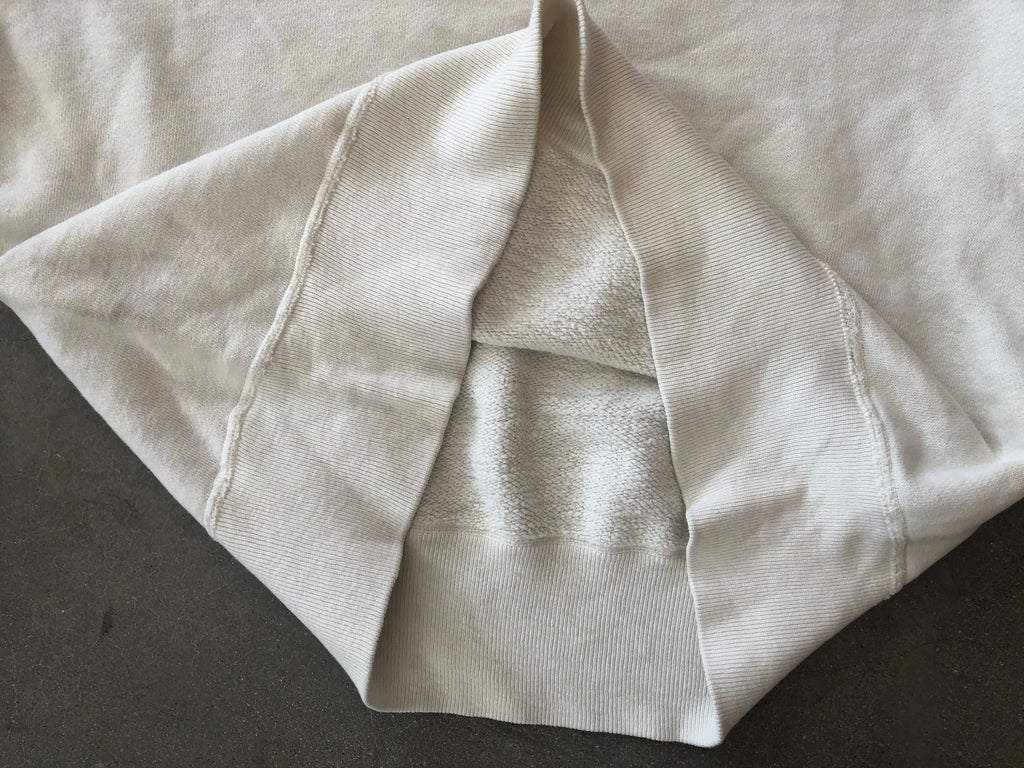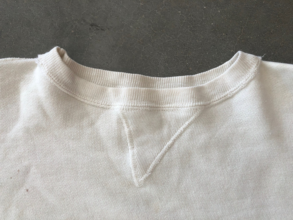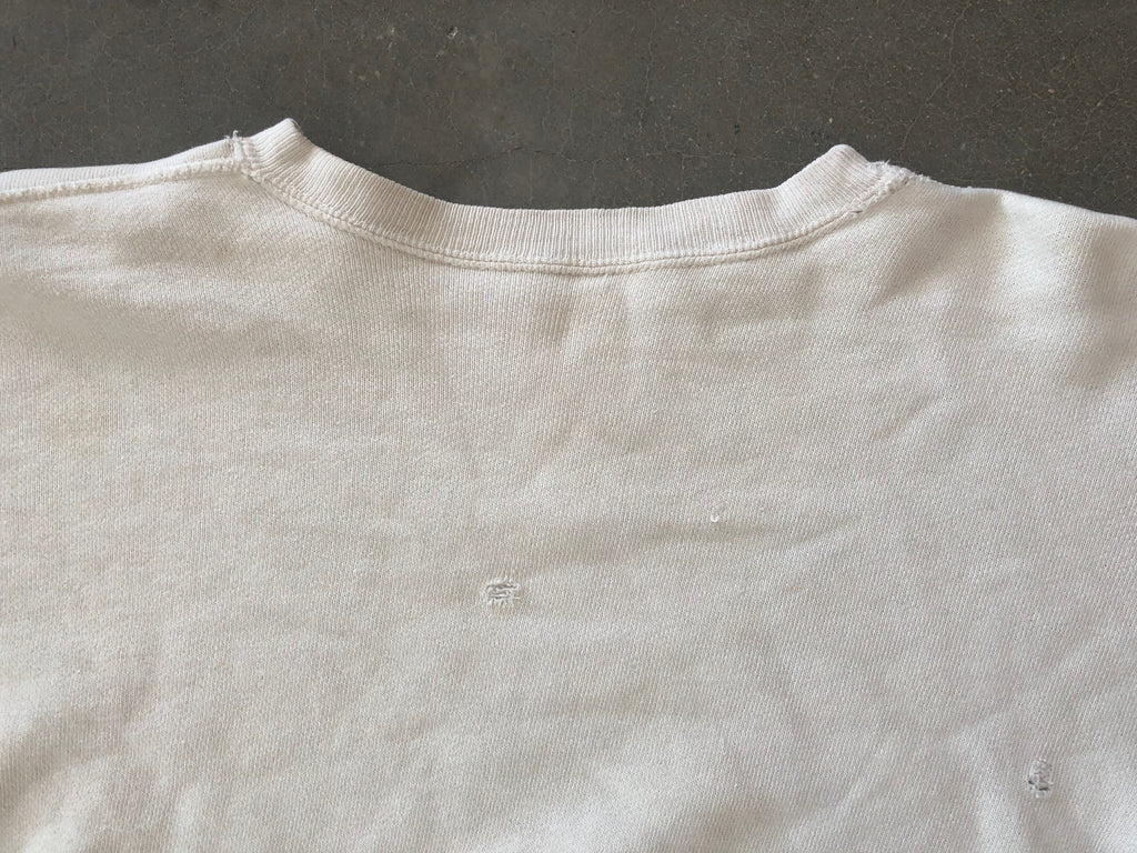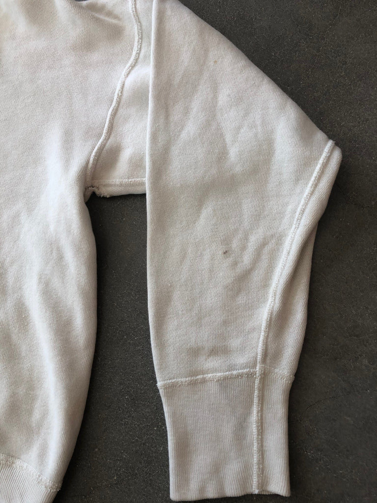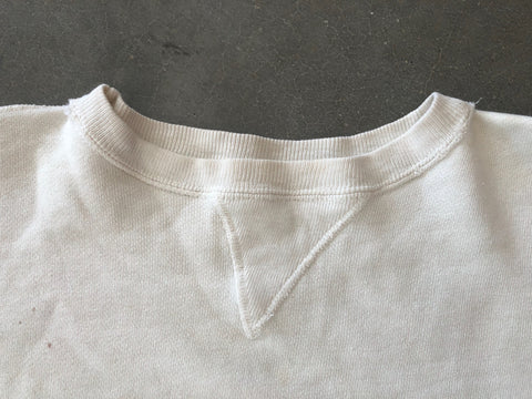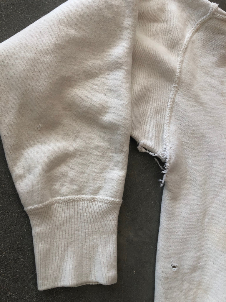1950s/60s white single V sweatshirt in nice solid condition. Size is small measuring 21" at the armpits, 22" shoulder seam to seam, 22" shoulder seam to cuff, and 19" from top of collar to hem. Condition overall is very good with good fleece but there is wear to collar and some minor holes here and there.