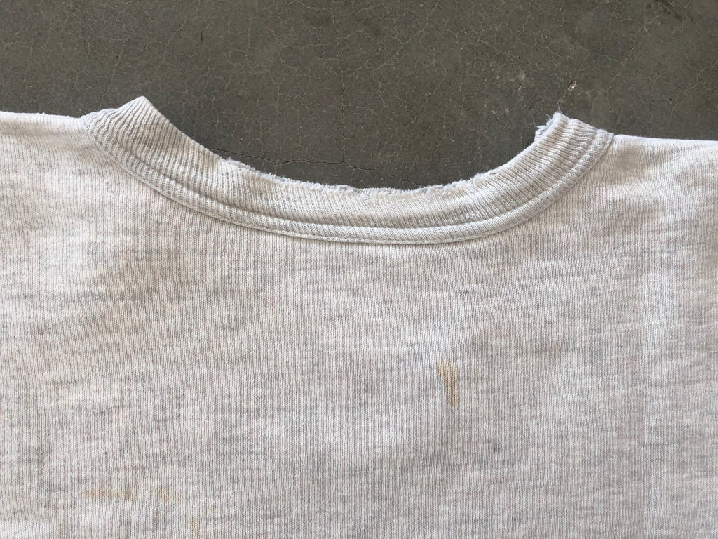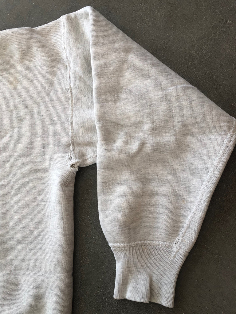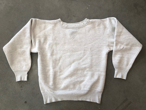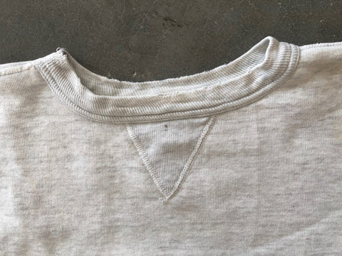 1950s/60s heather gray single V sweatshirt in nice solid condition. Size is small measuring 19" at the armpits, 18.5" shoulder seam to seam, 19" shoulder seam to cuff, and 20" from top of collar to hem. Condition overall is very good with thick fleece but there is wear to collar and some minor holes here and there.