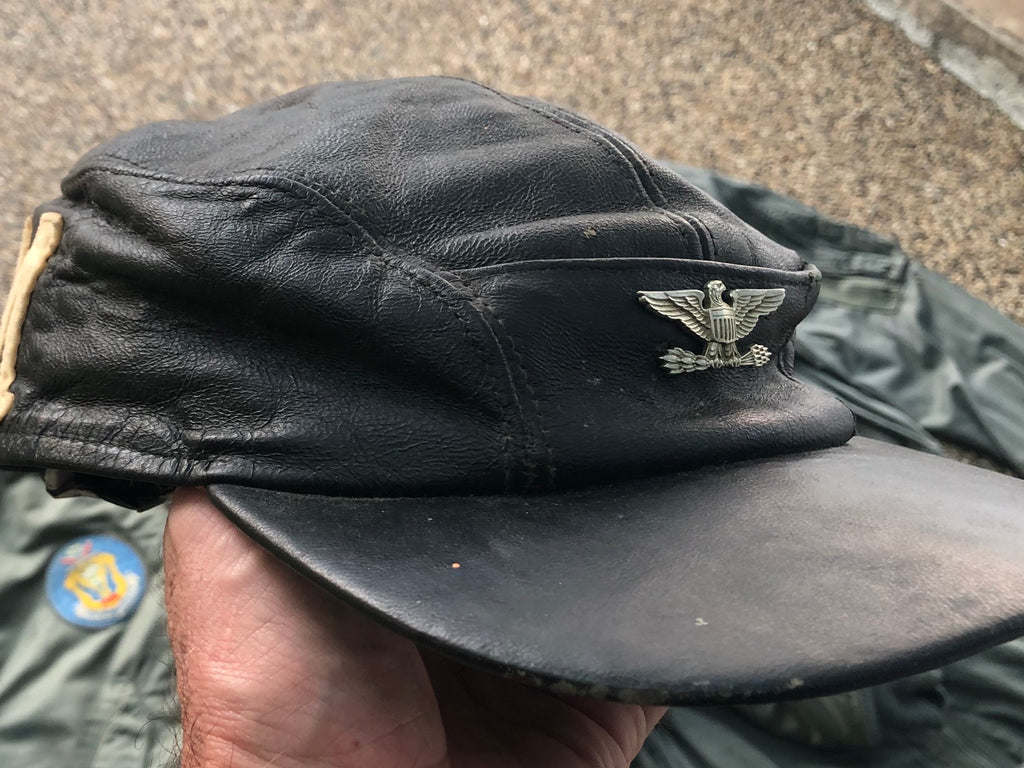 Uniform grouping for a Colonel Dinwiddie of the 509th Bomb Wing In the 60s. Includes a 1962 dated L-2B flight jacket, K-2N flight suit and custom leather squadron cap. The 509th was formed at the end of WWII solely for the purpose of dropping the atomic bombs on Japan, which they most certainly did with Enola Gay and Bockscar dropping atom bombs on Hiroshima and Nagasaki. When Dinwiddie served the wing was likely flying B-47 bombers or maybe B-52s by 1966 in which they participated in The Arclight missions inVietnam out of Guam.