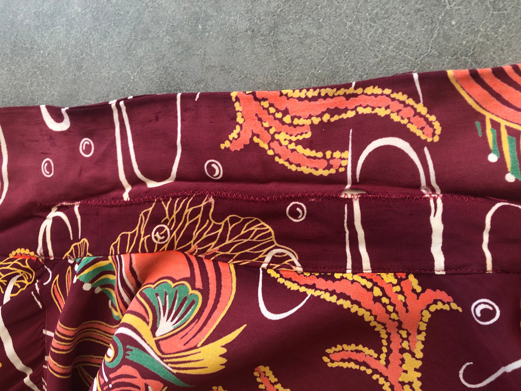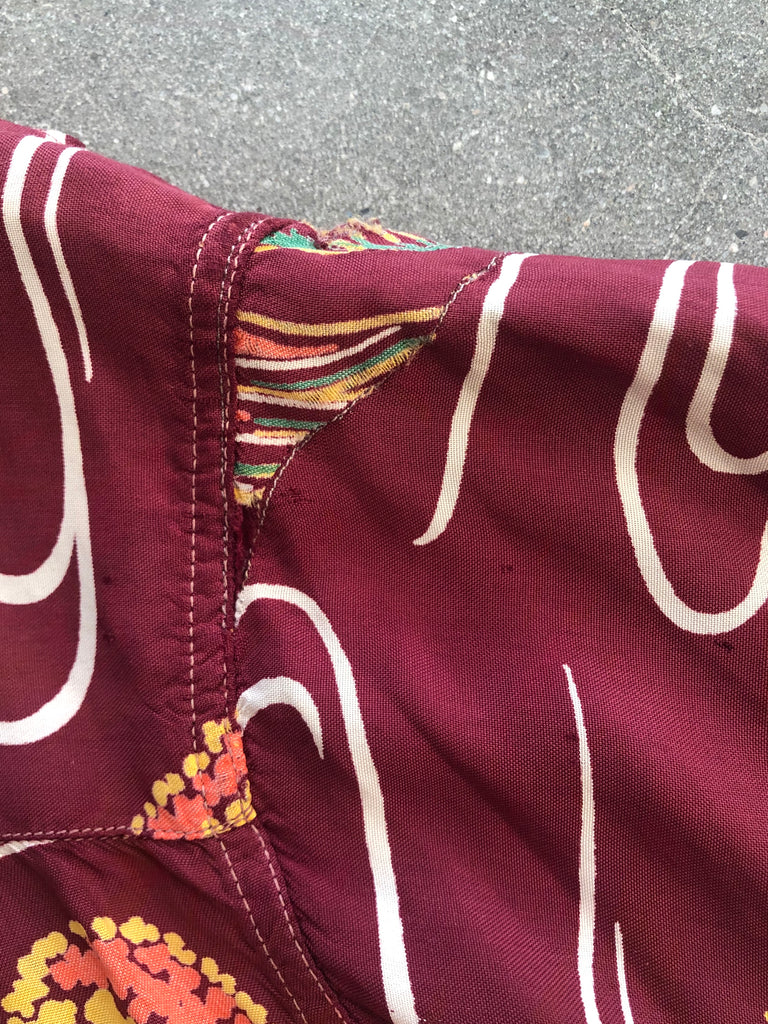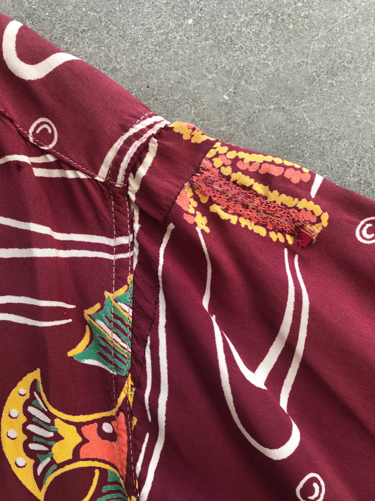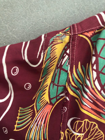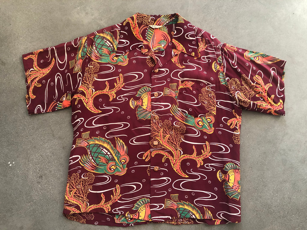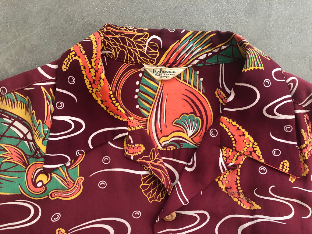 Kalakaua bug eyed fish hawaiian shirt with numerous repairs and flipped collar. Shirt is tagged large and measures 23.5 inches across the armpits, 19 inches across the shoulders, and 28 inches long from top of collar to hem. Great design in unusual colorway in wearable condition.