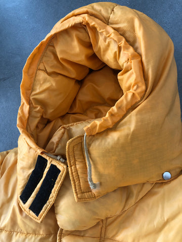 This particular parka has a yellow nylon ripstop shell with the same lining. I see lots of these and later parkas with 60/40 shells and blue ripstop shells with same yellow lining but the yellow on yellow ripstop is uncommon. Condition is very good overall, this one has been worn and used lightly and it shows on the cuffs and with small holes shown in the pics but overall this parka is in great condition. Size is a medium tagged and it measures 23 inches armpit to armpit, shoulders 19-1/2 inches seam to seam, 27 inches shoulder seam to cuff for arm length and 32 inches from base of collar to hem. Having said all that, measurements like these for a baffled parka are only somewhat helpful. I am 5 foot 9 inches and a bit bit heavy at 195 lbs. I put this parka on and can wear it over a Levis jacket comfortably and it fits well. In fact i might keep it, except for the fact that I don't need another!