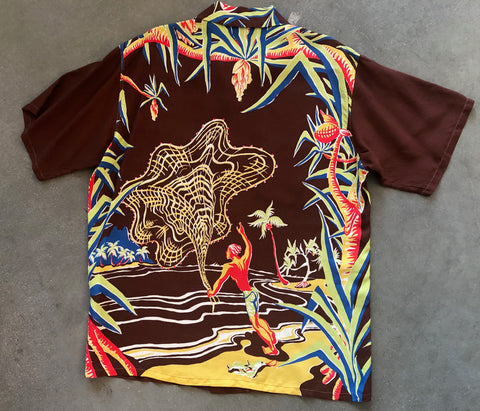 Netfisherman Hawaiian shirt in mint condition size medium. This is an older Sun Surf replica of an ArtVouge print. SunSurf really did a good job on this one, everything about it including buttons, cut, stitching and rayon quality is superb. Hard to find these days if it still fit it wouldn't be for sale. Shirt measures 22 inches across th armpits, 18.5 inches across the shoulders, and 29 inches from top of collar to hem along the back. Shirt has been worn a little and cleaned but the rayon is nice and thick with a nice shimmy and without significant wear, holes, or damage.