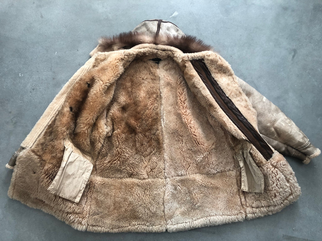 SOLD B-7 Flight Parka in excellent wearable condition. I have had a number of these parkas over the years and usually they are time bombs that deteriorate every time you pick them up. Not this one, it actually could be worn without worry, the shoulders are nice and sound as well as everything else about this parka. The main zipper is broken but the buttons work just fine and everything about this parka is original. The pocket zippers in good working condition. Size is 44 regular by the tag and measures 24 inches armpit to armpit.
