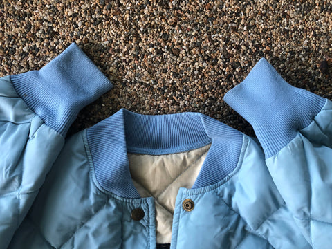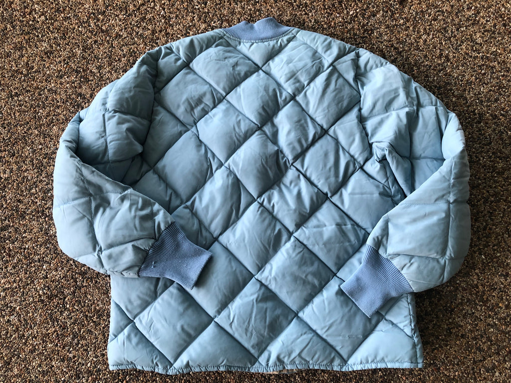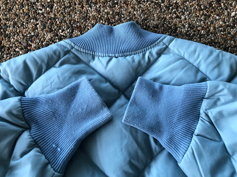 Eddie Bauer Skyliner jacket in nice wearable condition. Lightweight nylon shell inside and out with heavy EB snaps look to be from late 70s or early 80s. This is a woman’s jacket per the snap orientation and cut of jacket. No size tag; measures 21 inches armpit to armpit, 15-1/2 inches shoulder seam to shoulder seam, 26 inches shoulder seam to end of cuff, and 26 inches from top of collar to hem. Condition is excellent with minor piling on knit components.